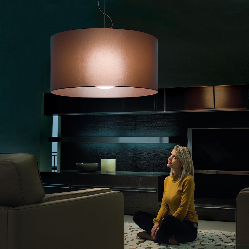 The morosini fog arc ceiling light relies heavily on the blown glass which is encased inside a fabric ponge shade as it diffuses the light to give the effect of slight fog.